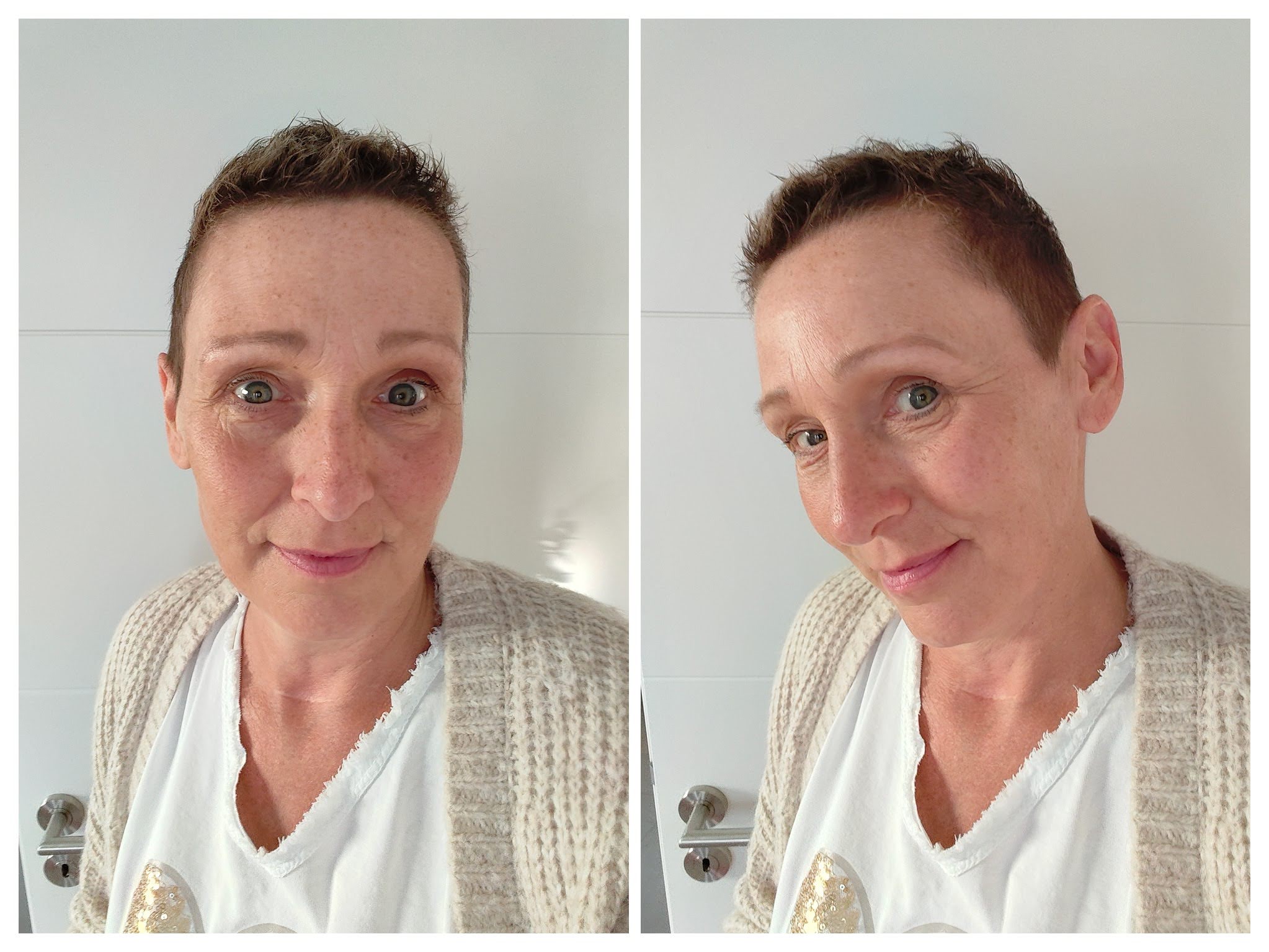 Samstagmorgen, wir frühstücken noch ganz entspannt mit unserer Enkeltochter und dann mache ich mich zu Fuss auf den Weg zum Friseur. Wir sind in der glücklichen Lage an unserem Wohnort in nur zehn Minuten Entfernung ein Haarstudio zu haben. Und ich bin ein wenig aufgeregt. Meine Haare sind noch sehr kurz, aber dennoch müssen die Konturen in Form gebracht werden. Moni rasiert an den Seiten und im Nacken die ersten Fusseln weg. Am Oberkopf gibt es noch nichts zu schneiden. Es gefällt mir richtig gut, ich fühle mich wohl und mein Entschluss steht fest – ich werde meine Haare in der nächsten Zeit sehr kurz tragen. Mit meinen ständigen Hitzeattacken und dem Schweiß auf der Kopfhaut macht es keinen Sinn die Haare länger zu tragen. Ich habe zwar in den letzten Tagen das Gefühl, dass sich die Haare etwas kräuseln und die sogenannten Chemolocken hervortreten. Aber bei den meisten verschwinden die auch ganz schnell wieder. Ich will mir im Moment diese nervige Übergangszeit beim Wachsenlassen der Haare einfach nicht antun. Unzählige Bad-Hair-Days habe ich schon hinter mir und habe jetzt keine Lust darauf. Ich habe in den letzten Monaten die pflegeleichte Haarpracht schätzen gelernt. Selbst die letzte Frisur vor meinem Totalausfall gefällt mir nicht mehr. Wenn ich mir Fotos anschaue, weiß ich, was ich nicht mehr möchte. Vielleicht ist es aber auch das Rebellische in mir, das durch die ganze Therapie irgendwie geweckt wurde. Ich will nicht zurück in alte Muster und Strukturen. Das Leben nach dem Krebs ist und wird ein anderes als vor der Krebsdiagnose. Es ist die Zeit für einen Neuanfang – mit der Frisur und mit einigen Teilen in meinem Leben.